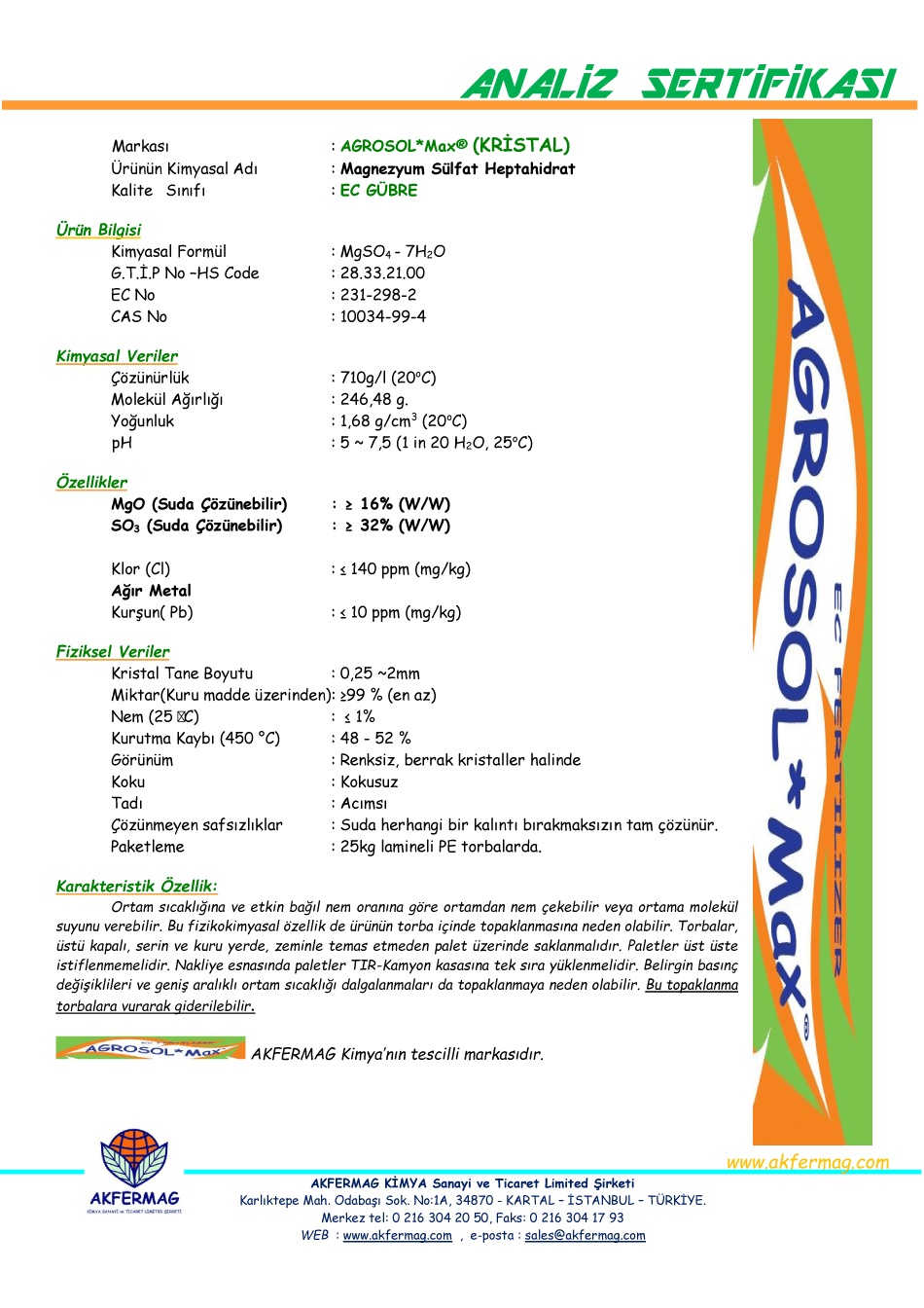 ➢ AGROSOL-Max® KRİSTAL sülfat formunda Magnezyum ve Kükürt Gübresi olup, %16 MgO ve %32 SO3 içeriklidir. Bitkilerin Magnezyum – Kükürt beslemesi ve eksikliğinin giderilmesinde çok etkilidir.