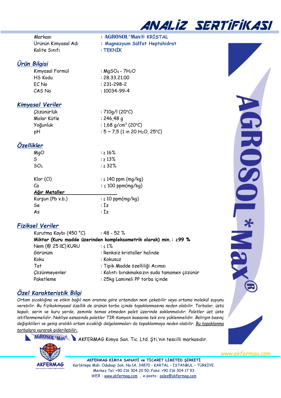 * % 15 MgO ve %28 SO3 Magnezyum Sülfat Heprahidrat Gübresi.
