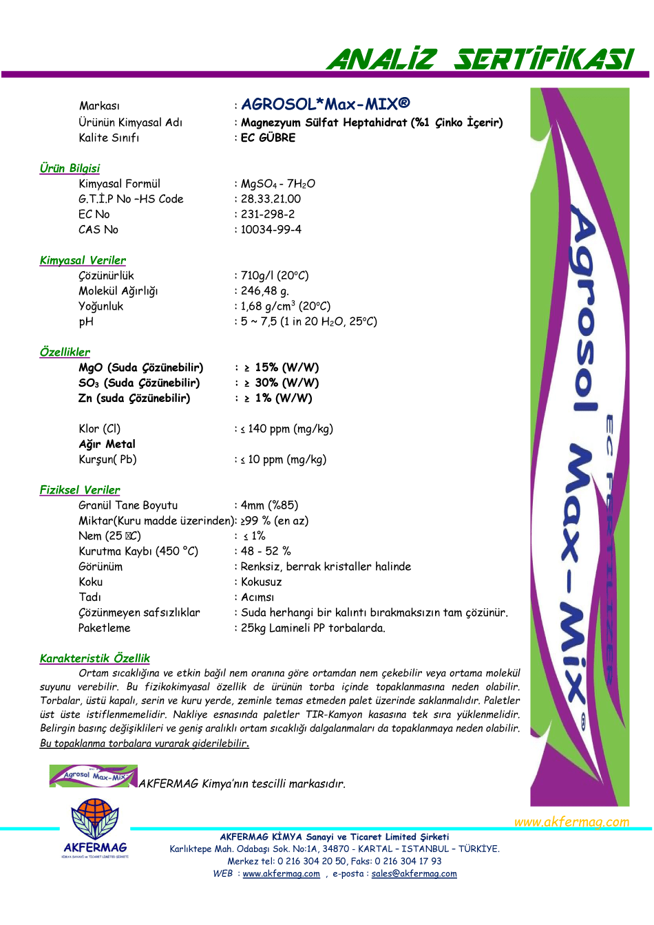 ➢ AGROSOL*Max®-MIX 4mm’lik tanecik boyutu sayesinde traktörle FIRFIR veya MİBZER ile uygulama için geliştirilmiş, Türkiye’deki İLK ve TEK ÇİNKOLU Magnezyum Sülfat Heptahidrat gübresidir.